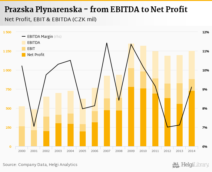 Prazska Plynarenska made a net profit of CZK 729 mil with revenues of CZK 13,751 mil in 2014, up by 30% and down by 18.4%, respectively, compared to the previous year. This translates into a net margin of 5.30%.