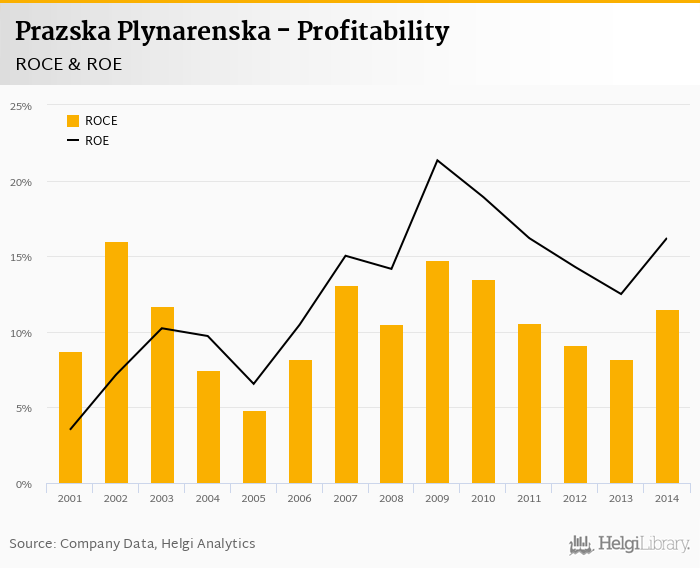 As far as Prazska Plynarenska's peers are concerned, Prazska Energetika generated ROE of 17.2% and ROCE of 12.2% in 2014. Bohemia Energy's profitability reached 54.0% and 89.6%, respectively. Centropol Energy operated with 26.9% and 37.7% returns in 2014.