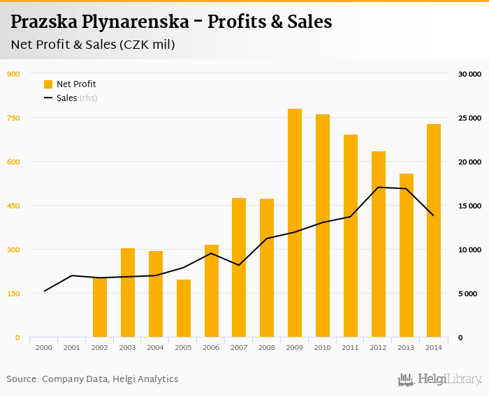 Prazska Plynarenska made a net profit of CZK 729 mil in 2014, up 30% compared to the previous year. Total sales reached CZK 13,751 mil, which is down 18.4% when compared to the previous year.