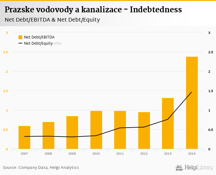 Prazske vodovody a kanalizace's net debt stood at CZK 1,585 mil and accounted for 1.47 of equity at the end of 2014. The ratio is up 0.706 pp compared to the previous year.