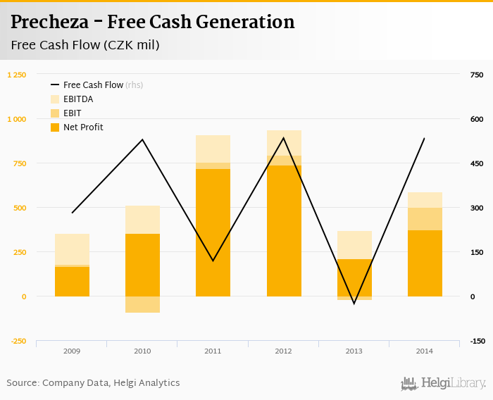 The company generated cash, defined by a sum of net profit and depreciation, of CZK 459 mil or 15.4% of sales. When investments are excluded, free cash flow reached CZK 534 mil, or 17.8% of sales in 2014.