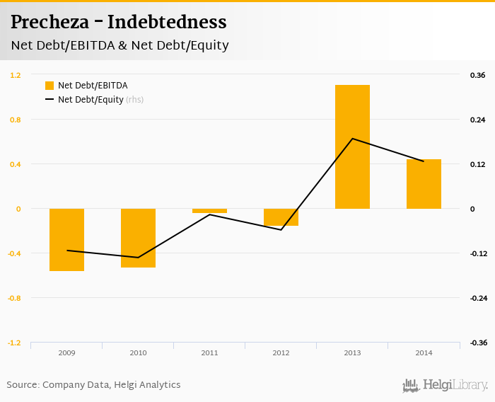 Precheza's net debt stood at CZK 259 mil and accounted for 0.125 of equity at the end of 2014. The ratio is down 0.062 pp compared to the previous year.