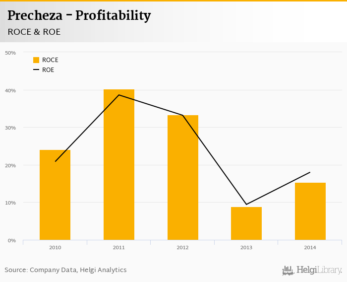 As far as Precheza's peers are concerned, Synthos Kralupy generated ROE of 30.2% and ROCE of 16.7% in 2014. Grupa Azoty's profitability reached 3.63% and 2.96%, respectively. DEZA operated with 21.7% and 14.2% returns in 2014.