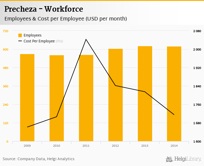 Precheza employed 620 employees in 2014, down 0.161% compared to the previous year. Historically, between 2009 and 2014, the firm's workforce hit a high of 621 employees in 2013 and a low of 561 employees in 2010.