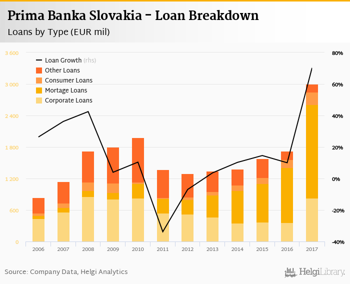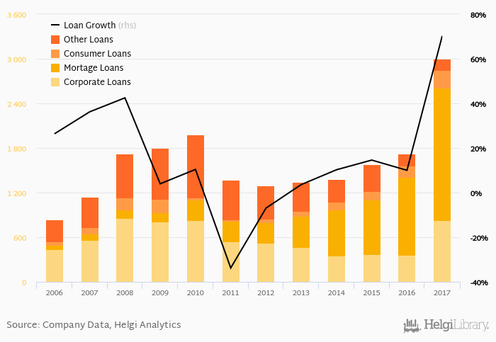 Mortgage loans represented 59.3% of the bank's loan book at the end of the year 2017, consumer further 7.96% and corporate loans 27.8% of total loans.