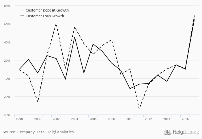 On the other hand, bank's customer deposit growth amounted to 65.7% at the end of 2017, up from 10.5% when compared to the previous year. Historically, the bank’s deposit growth reached an all time high of 65.7% in 2017 and an all time low of -11.5% in 2010. In the last decade, the average annual loan growth amounted to 7.64%.