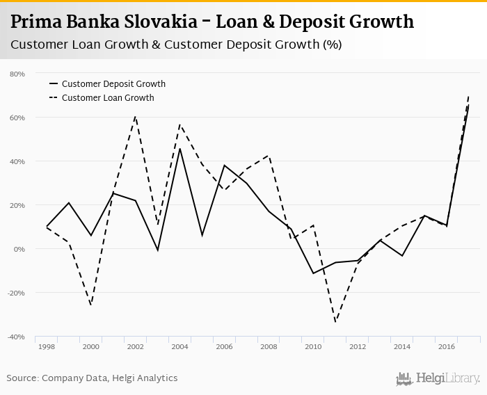 Prima Banka Slovakia's customer loan growth reached 70.2% in 2017, up from 10.00% compared to the previous year. Historically, the bank’s loans growth reached an all time high of 70.2% in 2017 and an all time low of -33.8% in 2011. In the last decade, the average annual loan growth amounted to 9.45%.