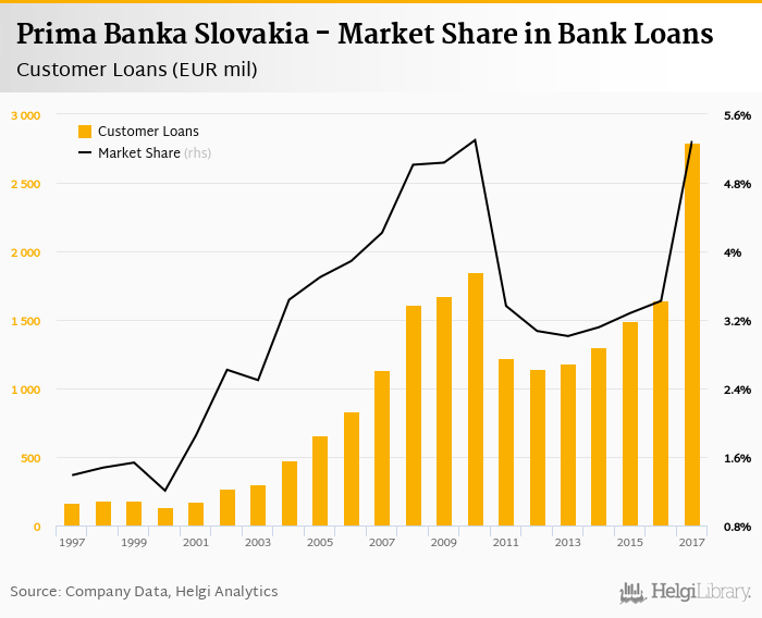 Prima Banka Slovakia's customer loans reached EUR 2,791 mil in 2017, up 70.2% compared to the previous year.