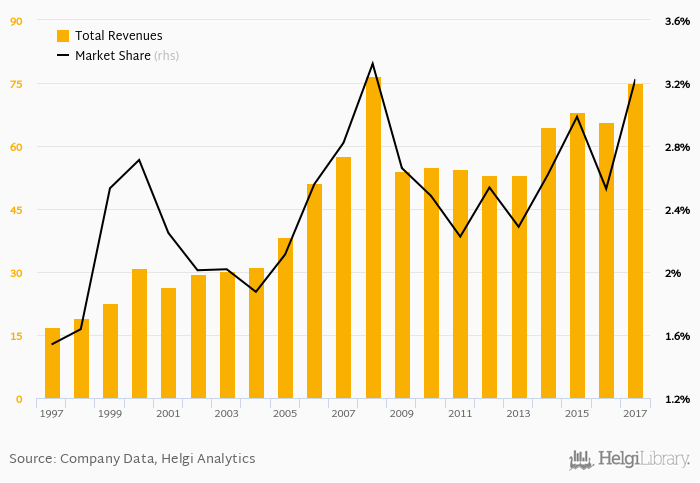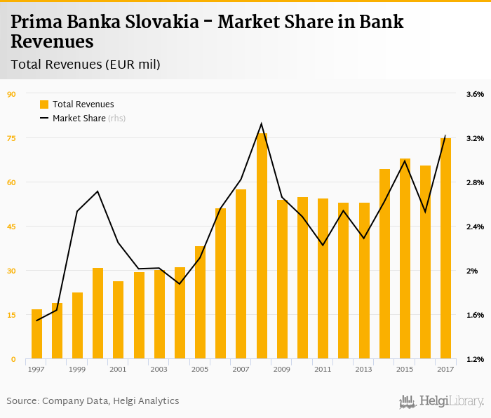 As a result, Prima Banka Slovakia accounted for 3.22% of all bank revenues generated by banks in Slovakia in 2017. Historically, the bank’s market share in total revenues reached an all time high of 3.32% in 2008 and an all time low of 1.54% in 1997.