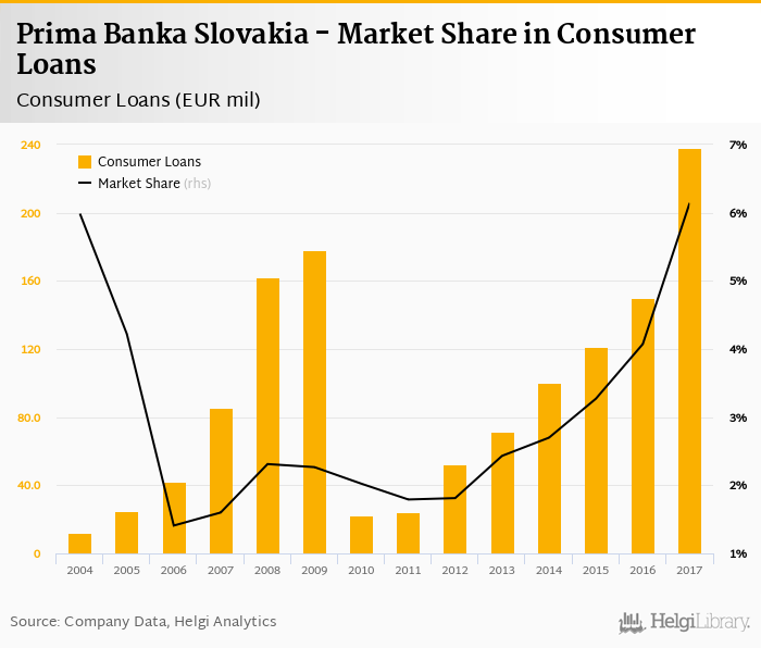 Prima Banka Slovakia's consumer loans reached EUR 238 mil in 2017, up 58.7% compared to the previous year.