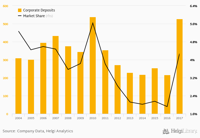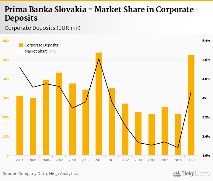 Prima Banka Slovakia accounted for 4.27% of all corporate deposits taken by banks in Slovakia at the end of 2017. Historically, the bank’s market share in corporate deposits reached an all time high of 5.63% in 2010 and an all time low of 1.92% in 2016.