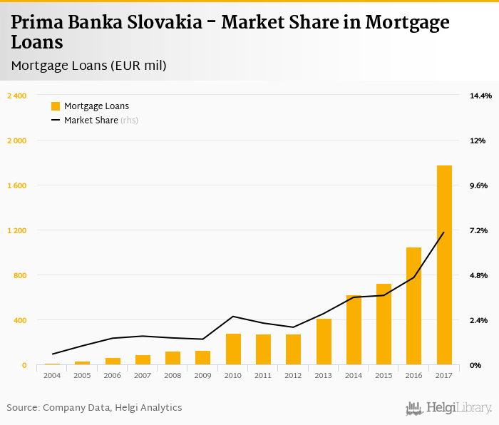 Prima Banka Slovakia's mortgage loans reached EUR 1,778 mil in 2017, up 70.0% compared to the previous year.