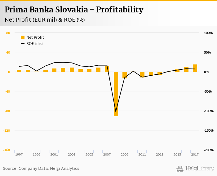 Comparing Prima Banka Slovakia with its closest peers, VUB Banka generated a net profit of EUR 175 mil with ROE of 11.2% in 2017, Slovenska Sporitelna netted EUR 164 mil (ROE of 12.0%) and Tatra banka announced a net profit of EUR 124 mil implying ROE of 12.5%.