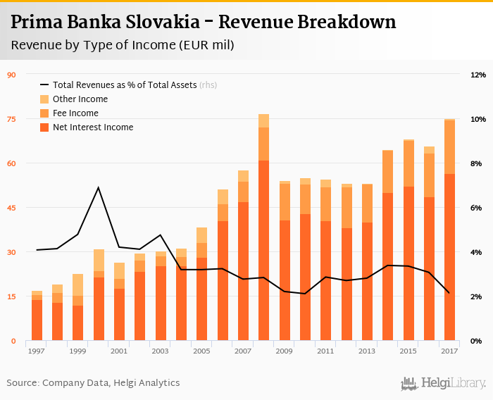Comparing Prima Banka Slovakia with its closest peers, VUB Banka generated total revenues of 3.66% of assets in 2017, Slovenska Sporitelna operated with 3.48% revenue margin and Tatra banka produced total income worth 3.40% of assets.