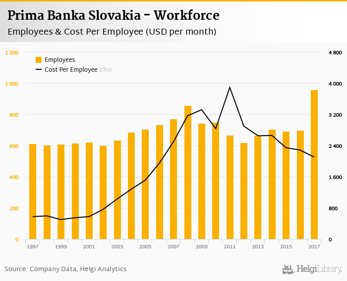 Prima Banka Slovakia employed 959 persons in 2017, up 37.0% when compared to the previous year. Historically, the bank's workforce hit an all time high of 959 persons in 2017 and an all time low of 601 in 2002.
