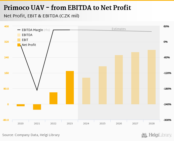 Primoco UAV made a net profit of CZK 171 mil with revenues of CZK 494 mil in 2023, up by 176% and up by 239%, respectively, compared to the previous year. This translates into a net margin of 34.5%.