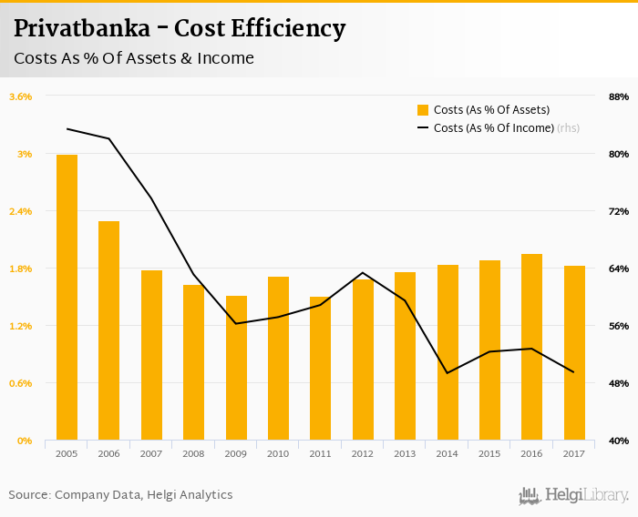 Comparing Privatbanka with its closest peers, VUB Banka operated in 2017 with a cost to income ratio of 48.8% in 2017, Slovenska Sporitelna reached 49.7% and Tatra banka some 57.0%.