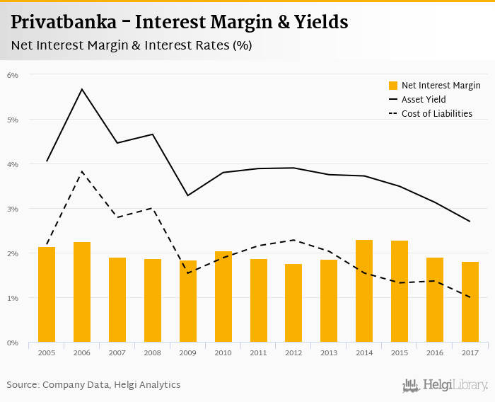 Comparing Privatbanka with its closest peers, VUB Banka operated in 2017 with a net interest margin of 2.65% in 2017, Slovenska Sporitelna reached 2.82% and Tatra banka some 2.27%.