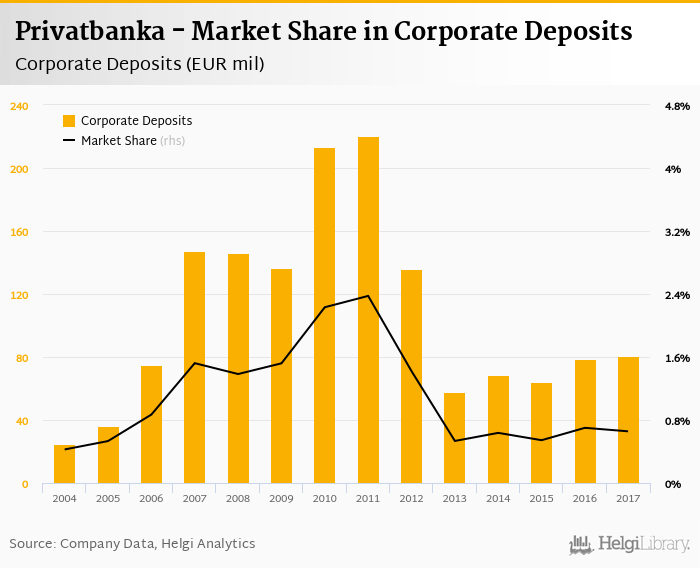 Privatbanka's corporate deposits reached EUR 80.9 mil in 2017, up 2.39% compared to the previous year.