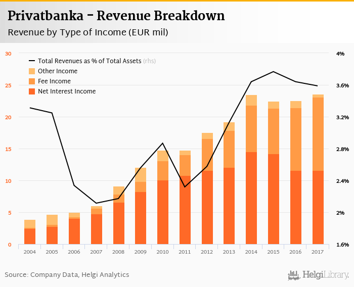 Privatbanka generated total banking revenues of EUR 23.6 mil in 2017, up 4.75% compared to the previous year.