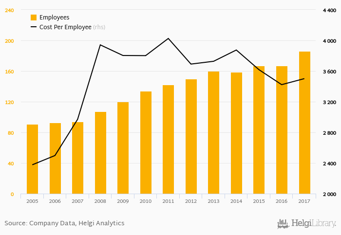 Privatbanka employed 186 persons in 2017, up 11.4% when compared to the previous year. Historically, the bank's workforce hit an all time high of 186 persons in 2017 and an all time low of 91.0 in 2005.