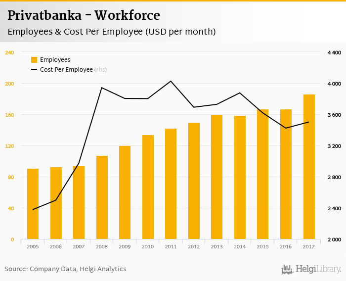 Comparing Privatbanka with its closest peers, VUB Banka had 3,942 employees and 236 branches in 2017, Slovenska Sporitelna operated with 4,250 people and 271 branches and Tatra banka had a network of 187 branches with 3,754 employees in 2017.