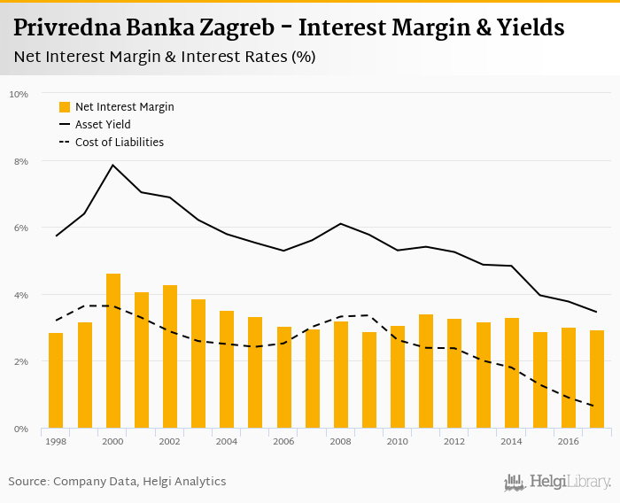 Comparing Privredna Banka Zagreb with its closest peers, Zagrebacka Banka operated in 2017 with a net interest margin of 2.80% in 2017, Splitska Banka reached 2.82% and Raiffeisenbank Croatia some 2.63%.