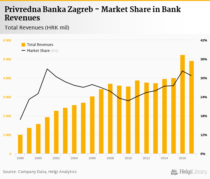 As a result, Privredna Banka Zagreb accounted for 30.7% of all bank revenues generated by banks in Croatia in 2017. Historically, the bank’s market share in total revenues reached an all time high of 32.8% in 2001 and an all time low of 16.7% in 1998.