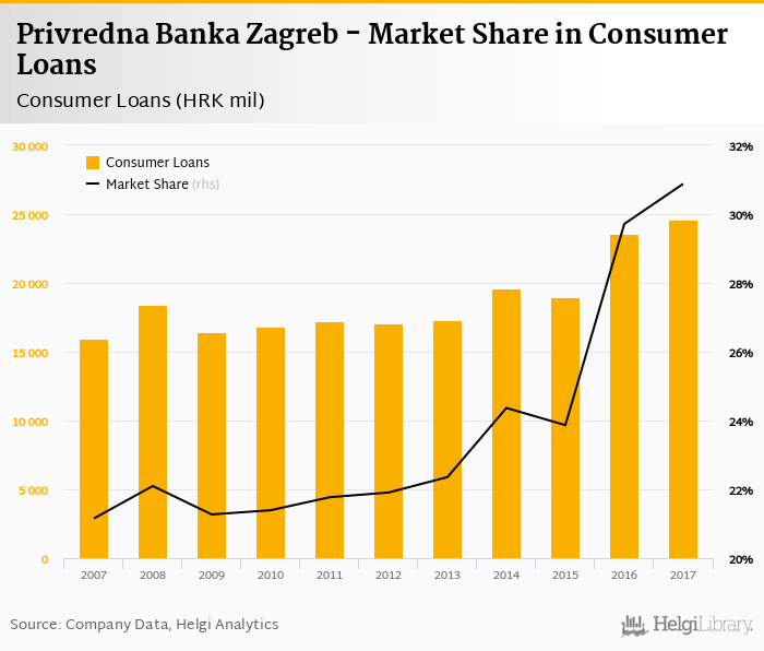 Privredna Banka Zagreb accounted for 30.9% of all consumer loans issued in Croatia at the end of 2017. Historically, the bank’s market share in consumer loans reached an all time high of 30.9% in 2017 and an all time low of 21.2% in 2007.