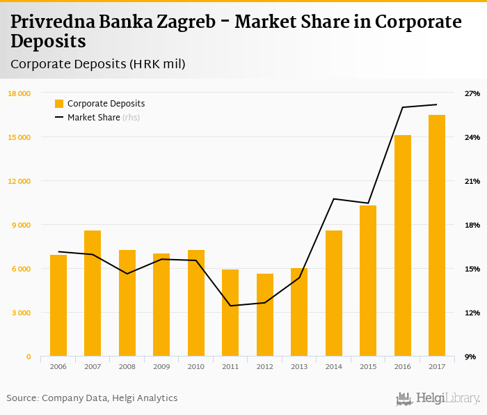 Privredna Banka Zagreb accounted for 26.2% of all corporate deposits taken by banks in Croatia at the end of 2017. Historically, the bank’s market share in corporate deposits reached an all time high of 26.2% in 2017 and an all time low of 12.4% in 2011.