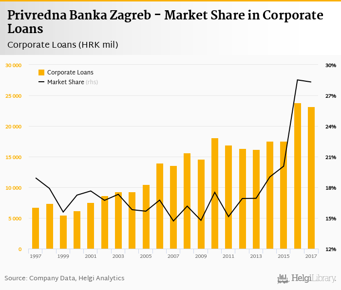 Privredna Banka Zagreb accounted for 28.3% of all corporate loans issued in Croatia at the end of 2017. Historically, the bank’s market share in corporate loans reached an all time high of 28.5% in 2016 and an all time low of 14.7% in 2007.