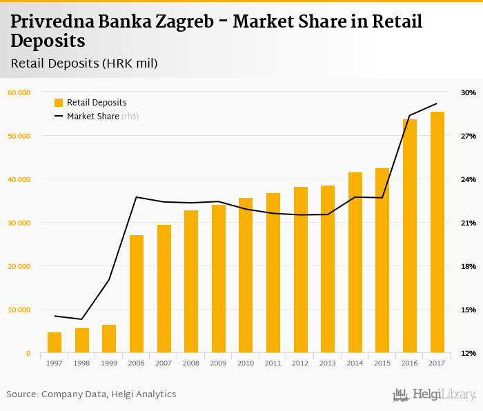 Privredna Banka Zagreb accounted for 29.2% of all retail deposits taken by banks in Croatia at the end of 2017. Historically, the bank’s market share in retail deposits reached an all time high of 29.2% in 2017 and an all time low of 14.3% in 1998.