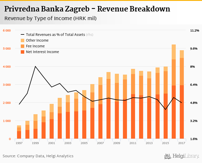 Comparing Privredna Banka Zagreb with its closest peers, Zagrebacka Banka generated total revenues of 4.30% of assets in 2017, Splitska Banka operated with 4.20% revenue margin and Raiffeisenbank Croatia produced total income worth 5.48% of assets.