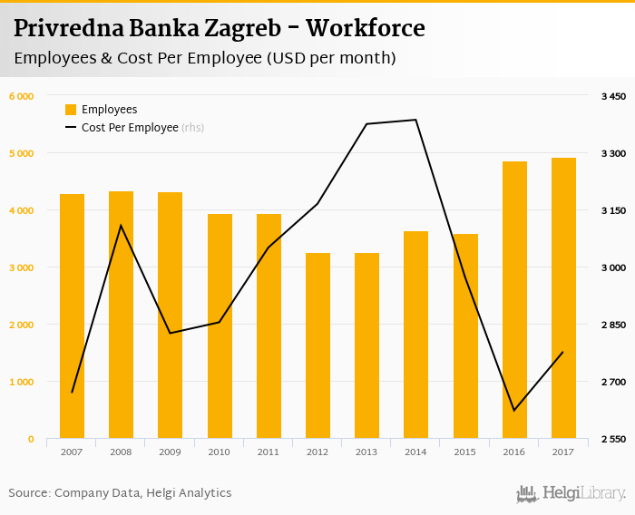 Privredna Banka Zagreb employed 4,922 persons in 2017, up 1.44% when compared to the previous year. Historically, the bank's workforce hit an all time high of 4,922 persons in 2017 and an all time low of 3,249 in 2013.