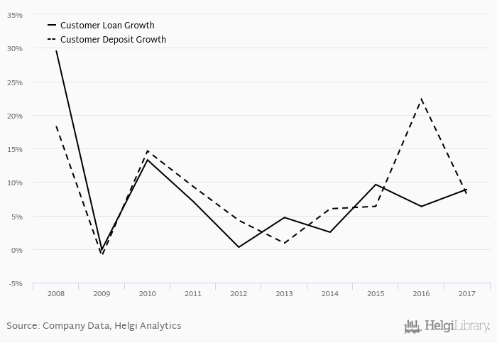 On the other hand, bank's customer deposit growth amounted to 8.08% at the end of 2017, down from 22.3% when compared to the previous year. Historically, the bank’s deposit growth reached an all time high of 22.3% in 2016 and an all time low of -1.02% in 2009. In the last decade, the average annual loan growth amounted to 0%.
