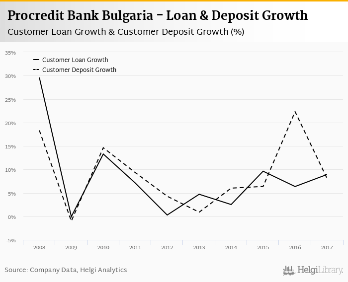 Procredit Bank Bulgaria's customer loan growth reached 8.92% in 2017, up from 6.36% compared to the previous year. Historically, the bank’s loans growth reached an all time high of 29.6% in 2008 and an all time low of -0.073% in 2009. In the last decade, the average annual loan growth amounted to 0%.
