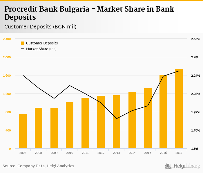Procredit Bank Bulgaria accounted for 2.28% of all customer deposits taken by banks in Bulgaria at the end of 2017. Historically, the bank’s market share in customer deposits reached an all time high of 2.28% in 2017 and an all time low of 1.86% in 2013.