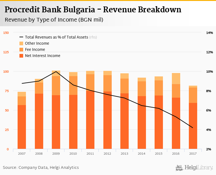 Comparing Procredit Bank Bulgaria with its closest peers, DSK Bank generated total revenues of 5.78% of assets in 2017, United Bulgarian Bank operated with 4.70% revenue margin and Raiffeisenbank Bulgaria produced total income worth 4.37% of assets.