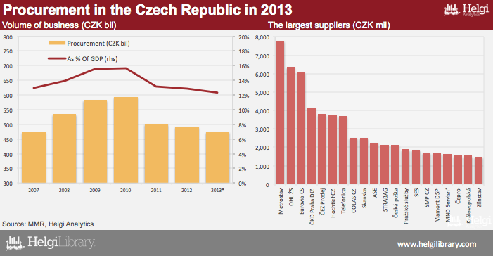 According to the Ministry of Internal Development, total procurement amounted to CZK 475 bil, or 12.3% of GDP. Construction companies such as Metrostav, Eurovia, or OHL belonged to the largest suppliers of the public institutions in 2013, according to the Ministry.