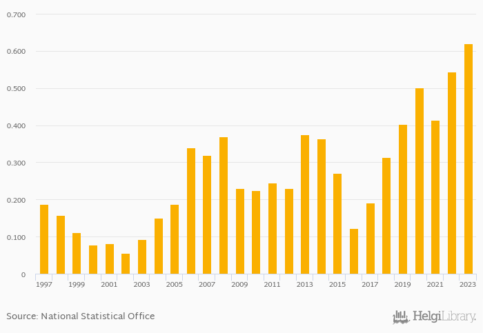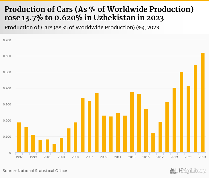 Historically, production of cars as a share of worldwide production in Uzbekistan reached an all time high of 0.620% in 2023 and an all time low of 0.055% in 2002.