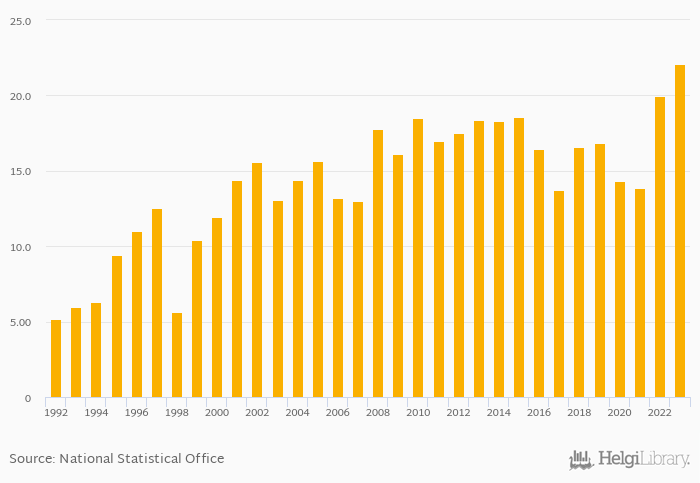 Production of cars per 1,000 people rose 10.6% to 22.1 vehicles in Malaysia in 2023, according to ACEA.