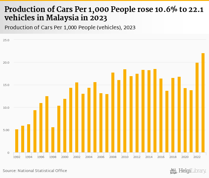 Historically, production of cars per 1,000 people in Malaysia reached an all time high of 22.1 vehicles in 2023 and an all time low of 5.15 vehicles in 1992.