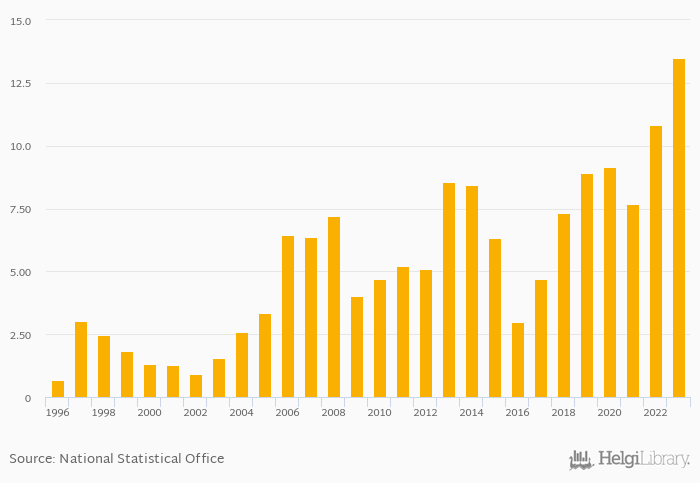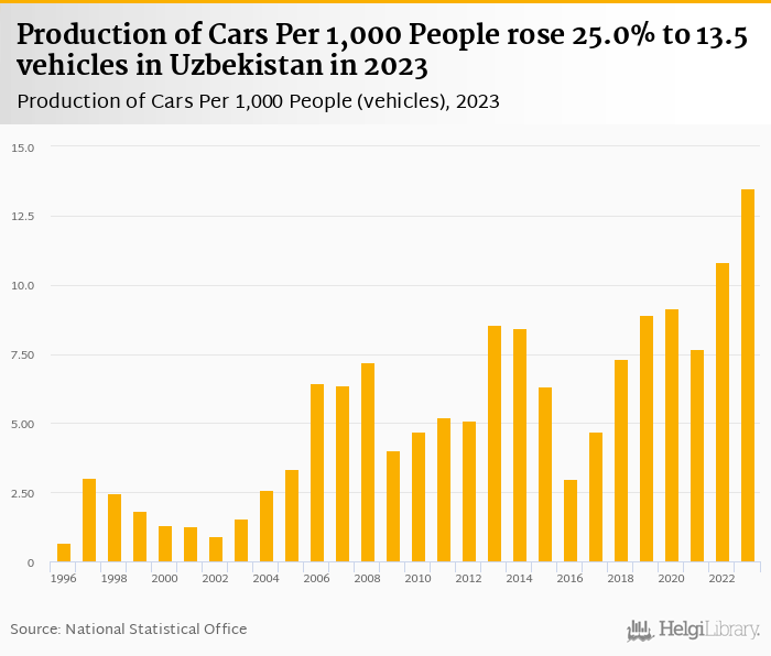 Production of cars per 1,000 people rose 25.0% to 13.5 vehicles in Uzbekistan in 2023, according to ACEA.