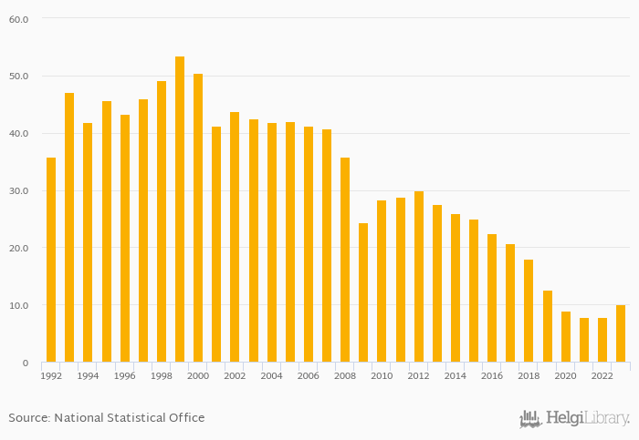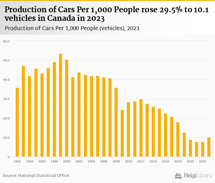 Production of cars per 1,000 people rose 29.5% to 10.1 vehicles in Canada in 2023, according to ACEA.
