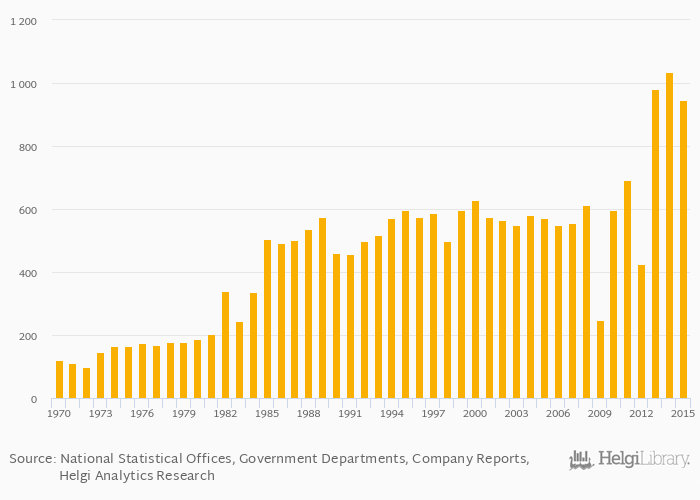 Historically, production of chromium ores and concentrates in Finland reached an all time high of 1,035 kt in 2014 and an all time low of 97.0 kt in 1972.