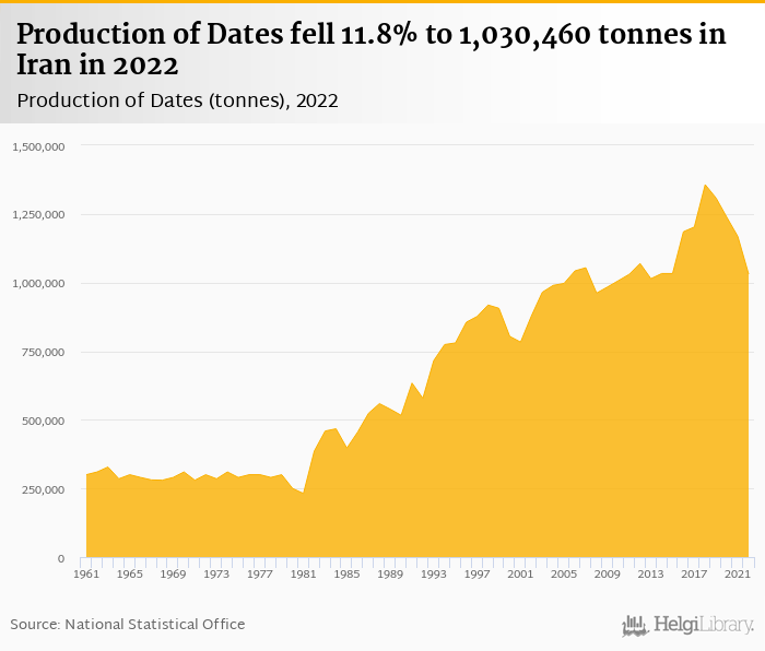 Historically, production of dates in Iran reached an all time high of 1,356,684 tonnes in 2018 and an all time low of 231,523 tonnes in 1981.