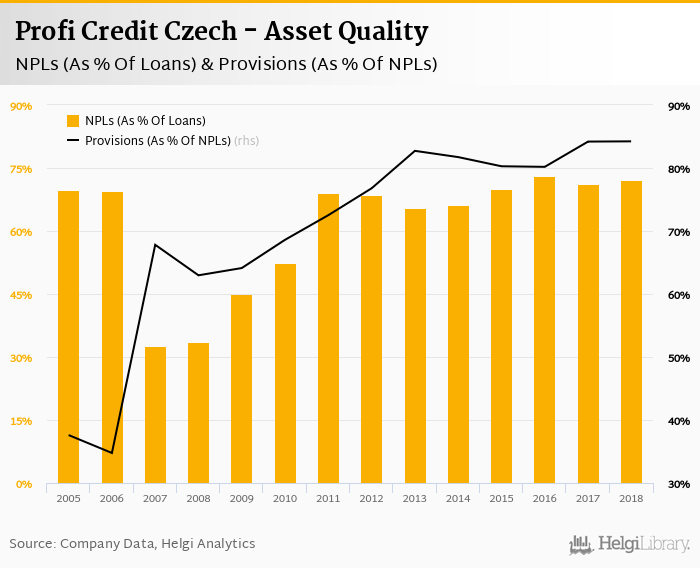 Profi Credit Czech's non-performing loans reached 72.2% of total loans at the end of 2018, up from 71.3% compared to the previous year. Historically, the NPL ratio hit an all time high of 73.2% in 2016 and an all time low of 32.7% in 2007.