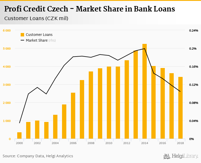 Profi Credit Czech accounted for 0.104% of all customer loans issued in Czechia at the end of 2018. Historically, the bank’s market share in customer loans reached an all time high of 0.199% in 2014 and an all time low of 0.034% in 2000.