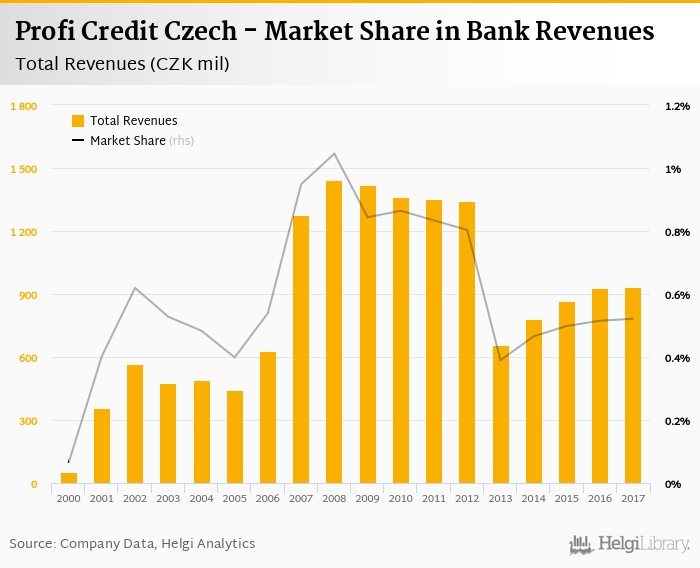 As a result, Profi Credit Czech accounted for 0.521% of all bank revenues generated by banks in Czechia in 2017. Historically, the bank’s market share in total revenues reached an all time high of 1.05% in 2008 and an all time low of 0.064% in 2000.