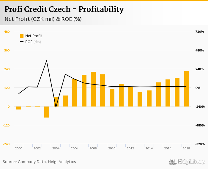 Profi Credit Czech made a net profit of CZK 226 mil in 2018, up 21.7% compared to the previous year. This implies a return on equity of 13.6%.